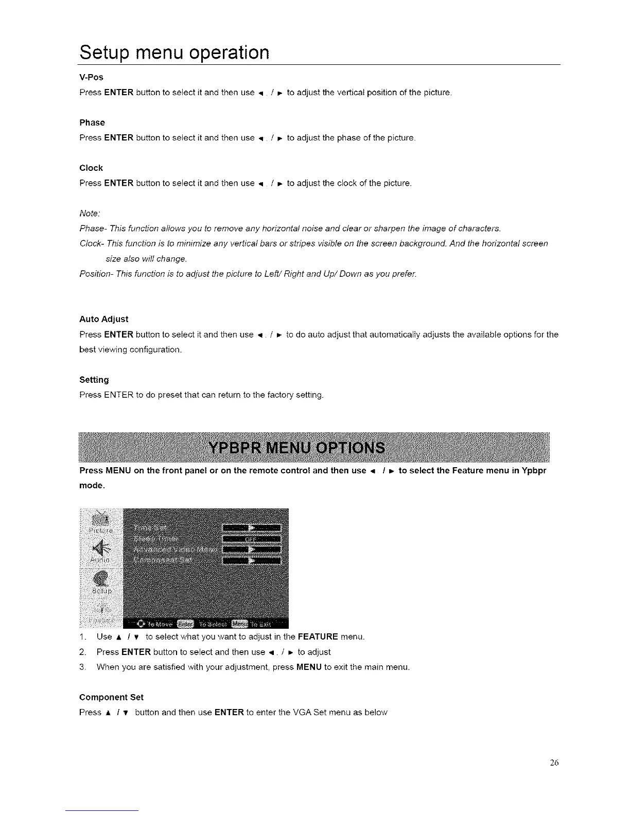 Press MENU on the front panel or on the remote control and then use 4 / m.to select the Feature menu in Ypbpr