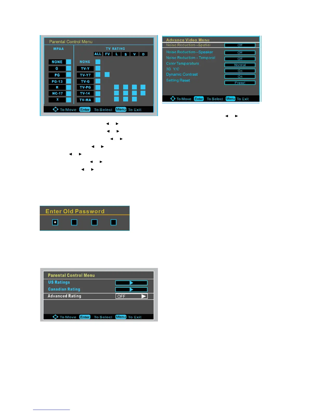 Press ENTER to enter the sub-menu and then uses the 0-9 to enter the correct password and the Parental Control Menu will