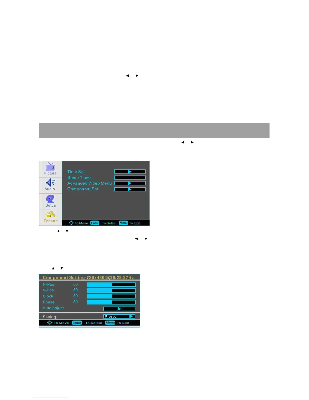 1. Use / to select what you want to adjust in the FEATURE menu.