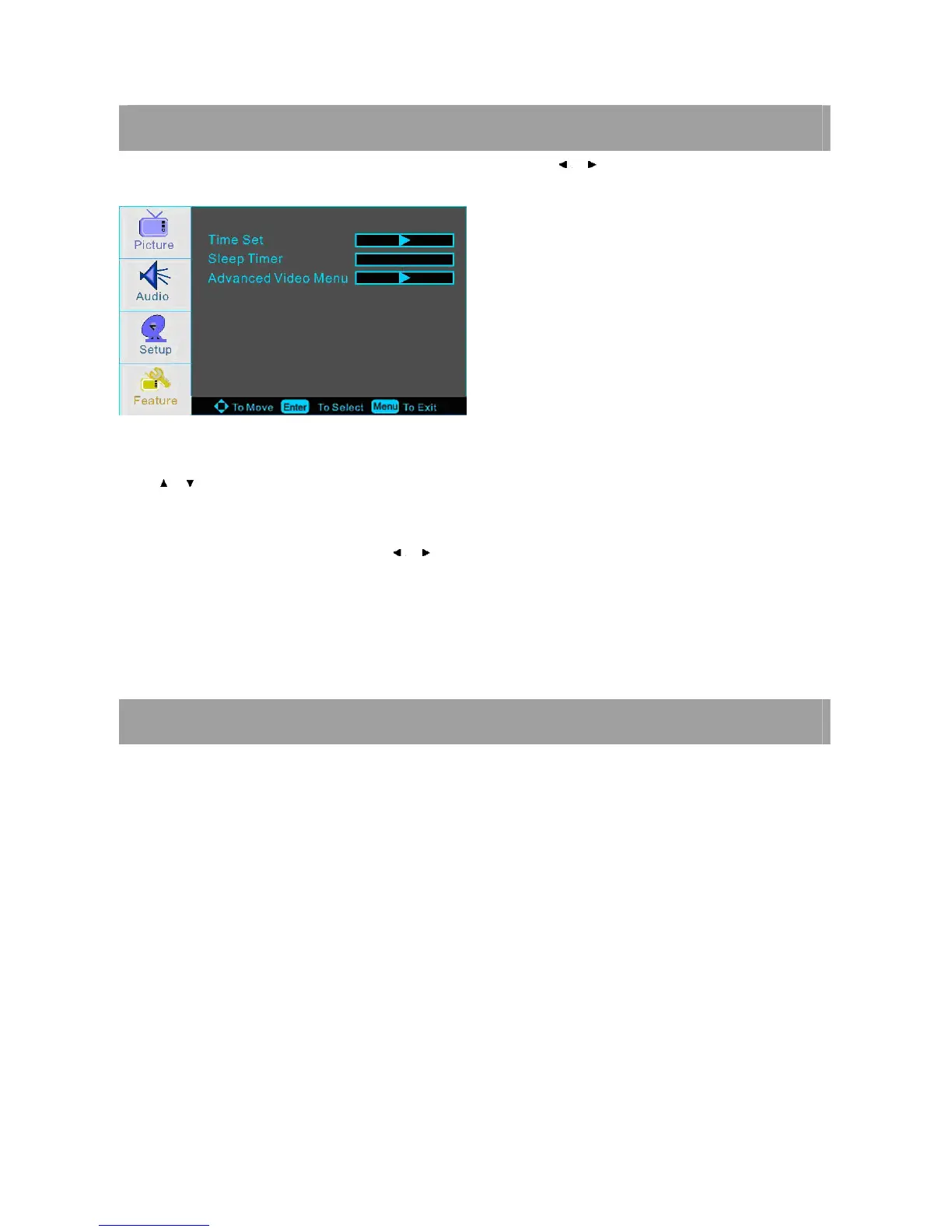 Press / button and then use ENTER the time set menu that allows you to set the time the TV will display.