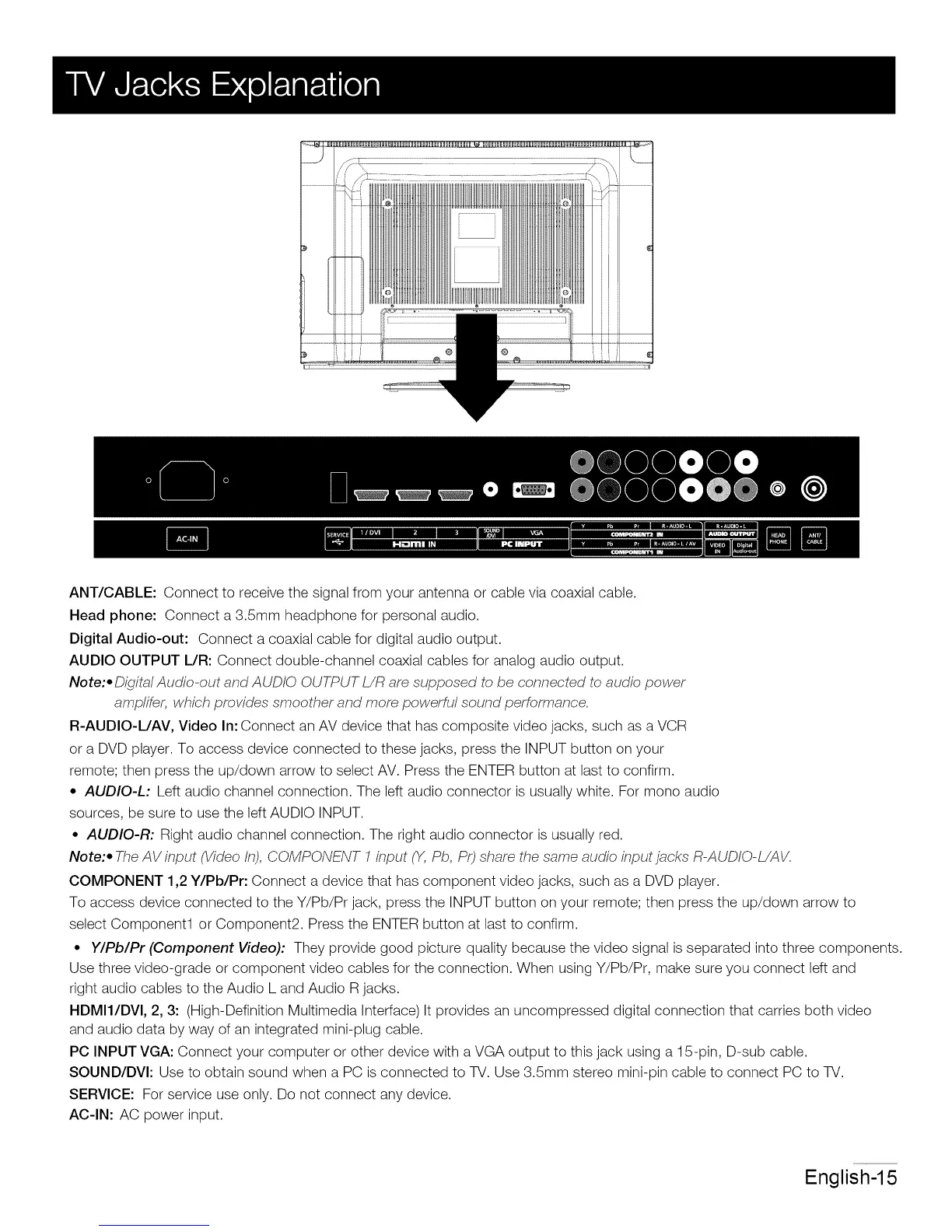 SOUND/DVI: Use to obtain sound when a PC is connected to TV. Use 3.5mm stereo mini-pin cable to connect PC to TV.