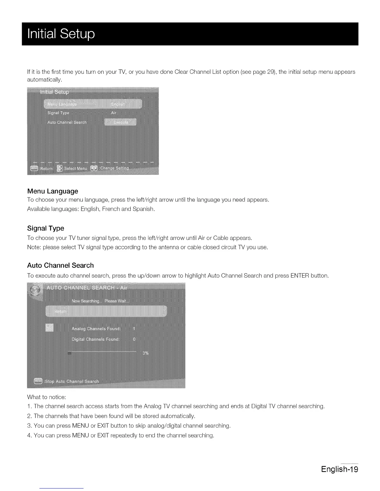 1. The channel search access starts from the Analog TV channel searching and ends at Digital TV channel searching.