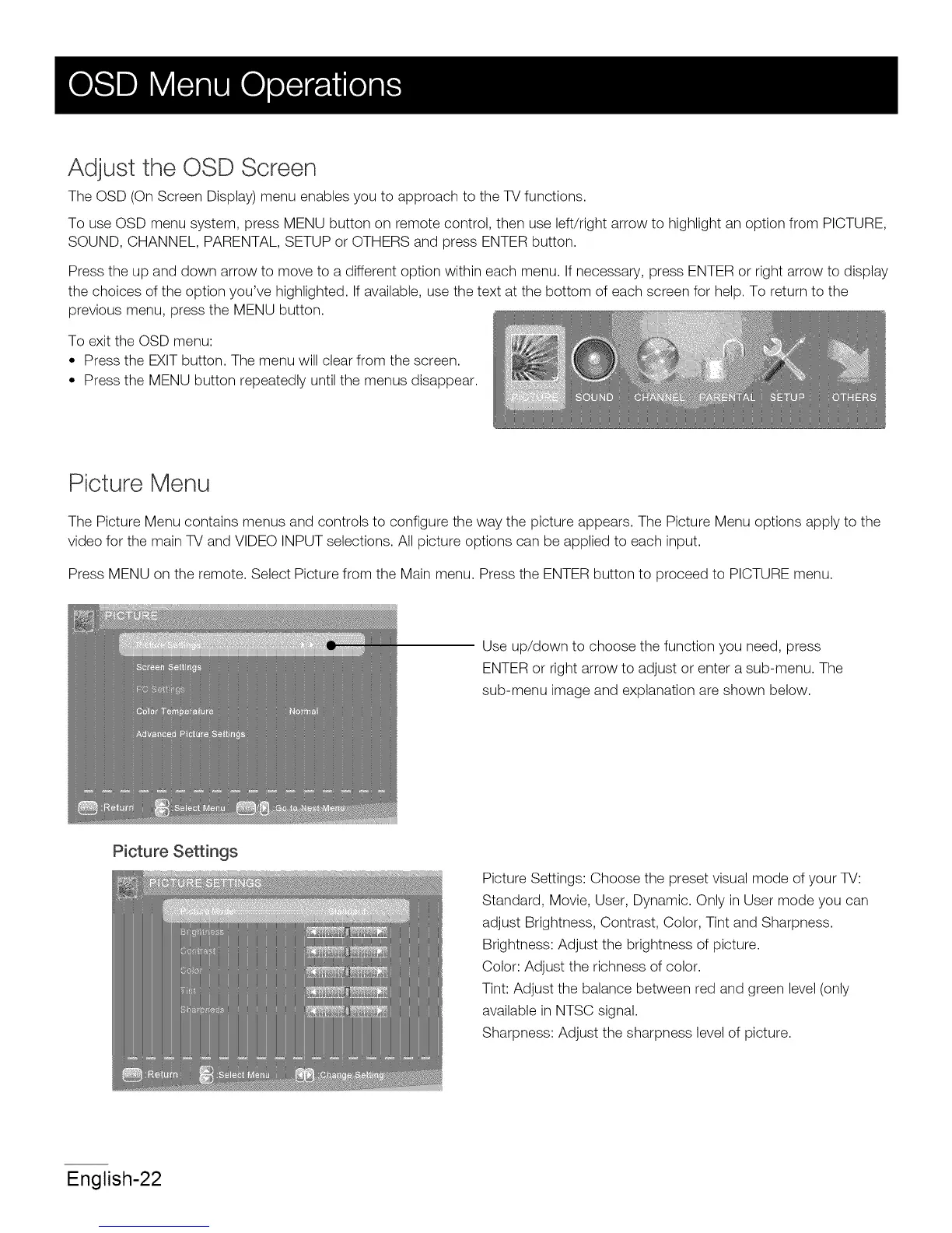 To use OSD menu system, press MENU button on remote control, then use left/fight arrow to highlight an option from PICTURE,