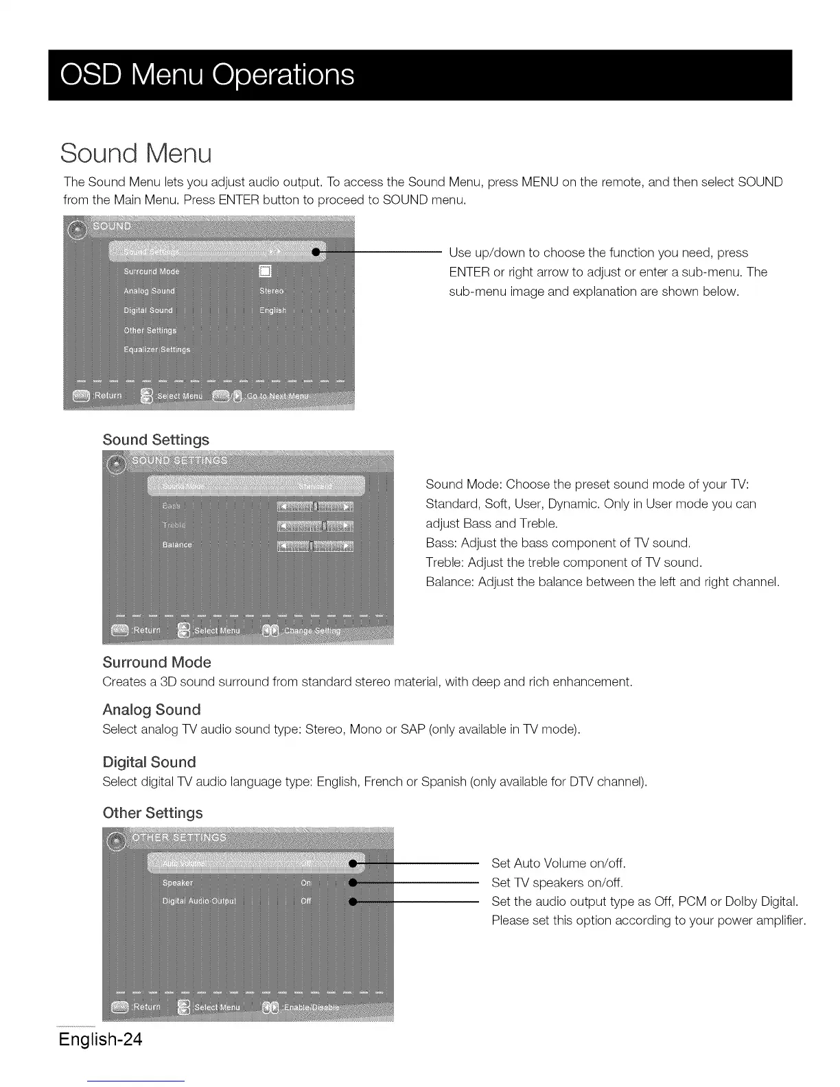The Sound Menu lets you adjust audio output. To access the Sound Menu, press MENU on the remote, and then select SOUND