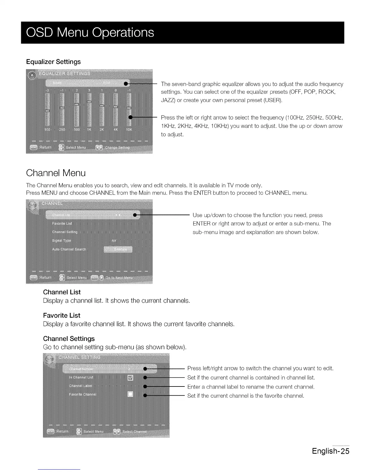 Press MENU and choose CHANNEL from the Main menu. Press the ENTER button to proceed to CHANNEL menu.