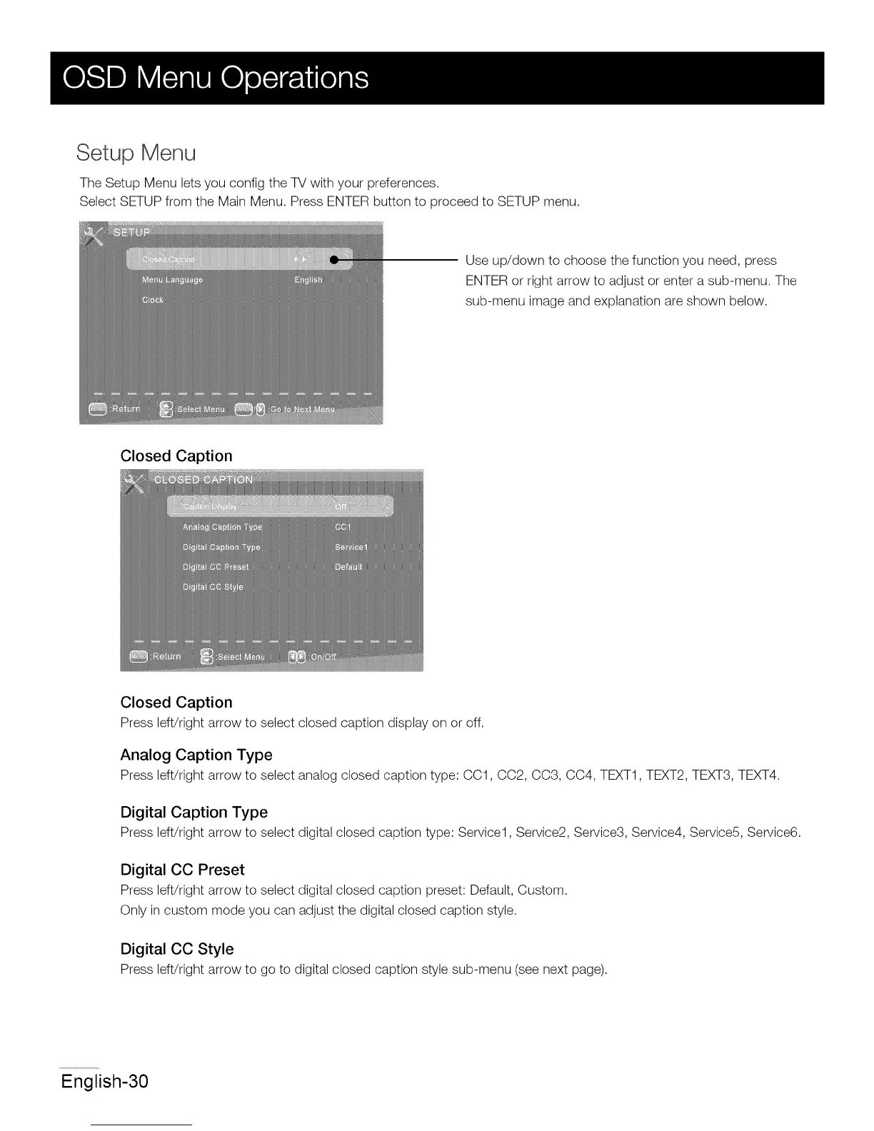 Press left/right arrow to select analog closed caption type: CC1, CC2, CC3, CC4, TEXT1, TEXT2, TEXT3, TEXT4.