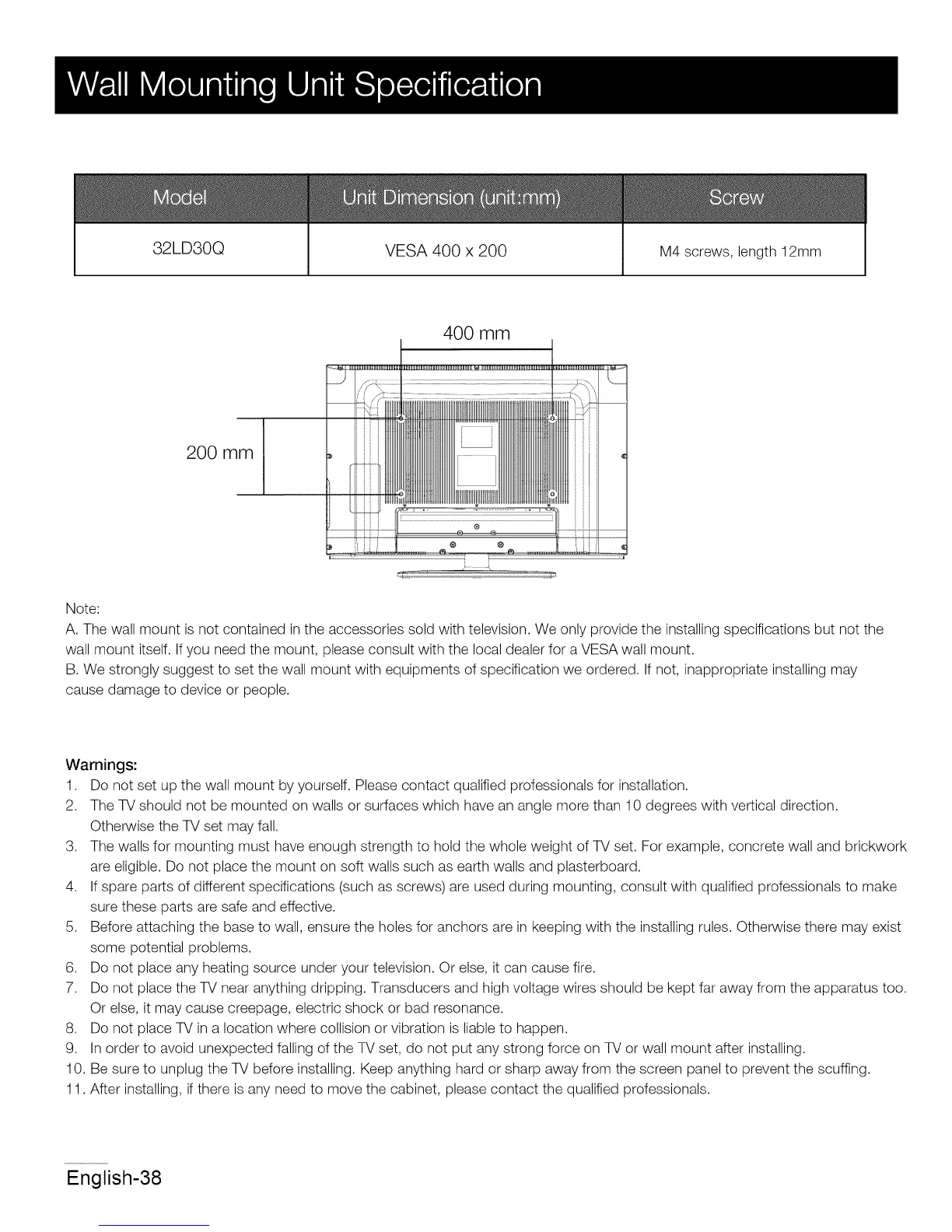 wall mount itself. If you need the mount, please consult with the local dealer for a VESA wall mount.