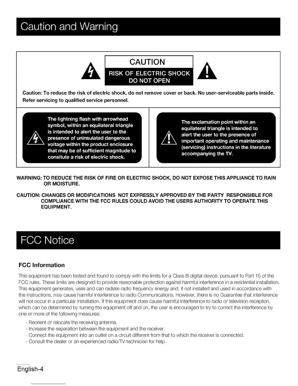 Caution: To reduce the risk of electric shock, do not remove cover or back. No user-serviceable parts inside.