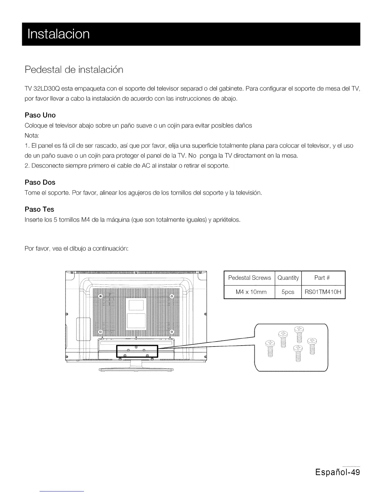 TV 32LD30Q esta empaqueta con el soporte del televisor separad o del gabinete. Para configurar el soporte de mesa del TV,