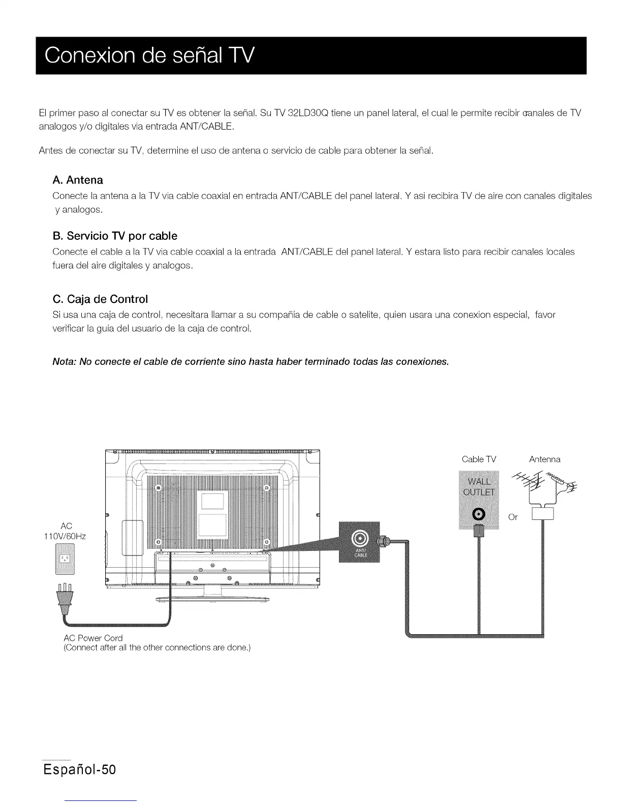Antes de conectar su TV, determine el uso de antena o servicio de cable para obtener la sepal.