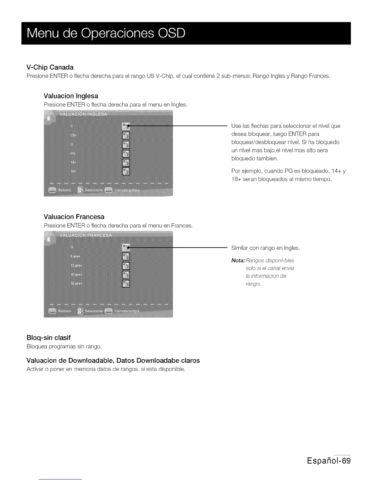 Presione ENTER o flecha derecha para el rango US V-Chip, el cual contiene 2 sub-menus: Rango Ingles y Rango Frances.