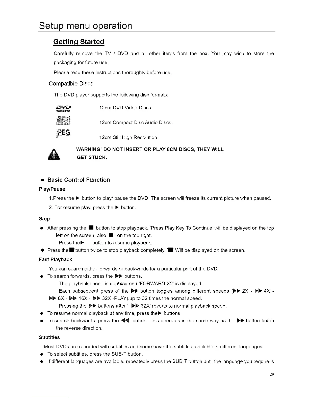 WARNING! DO NOT INSERT OR PLAY 8CM DISCS, THEY WILL
