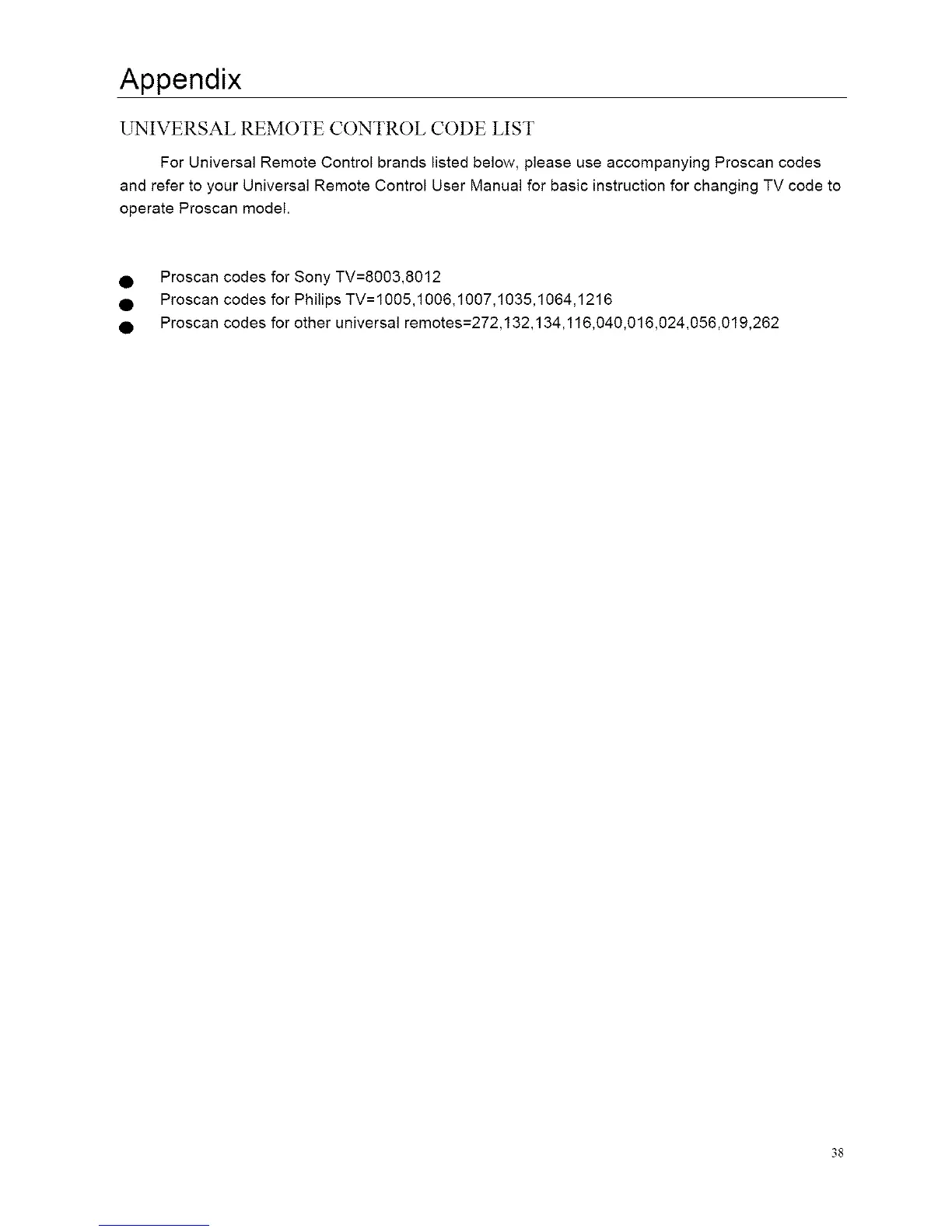 • Proscan codes for Philips TV=1005,1006,1007,1035,1064,1216