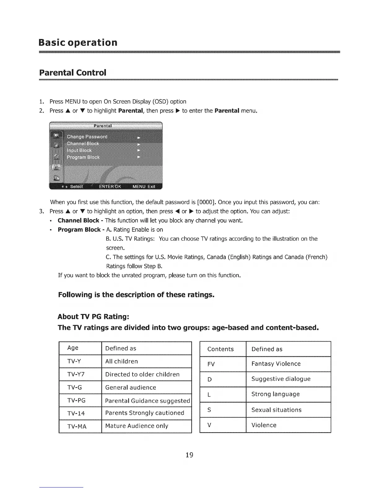 The TV ratings are divided into two groups: age=based and content=based.