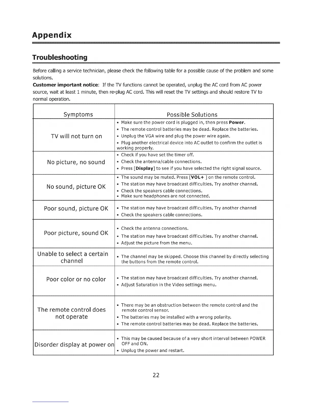 Customer important notice: If the TV functions cannot be operated, unplug the AC cord from AC power