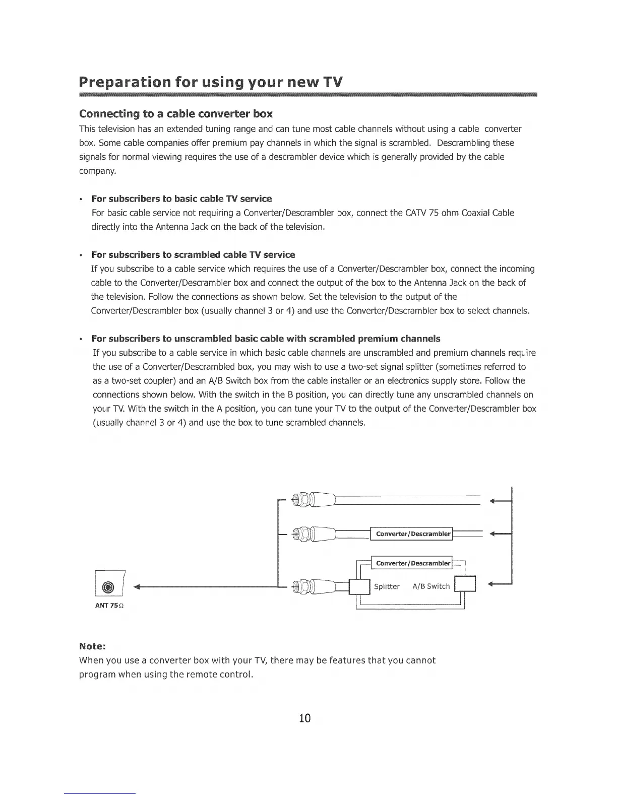 Converter/Descrambler box (usually channel 3 or 4) and usethe Converter/Descrambler box to select channels.