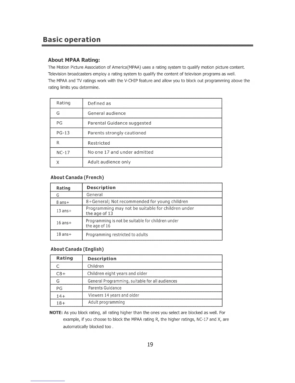 The MPAA and TV ratings work with the V-CHIP feature and allow you to block out programming above the