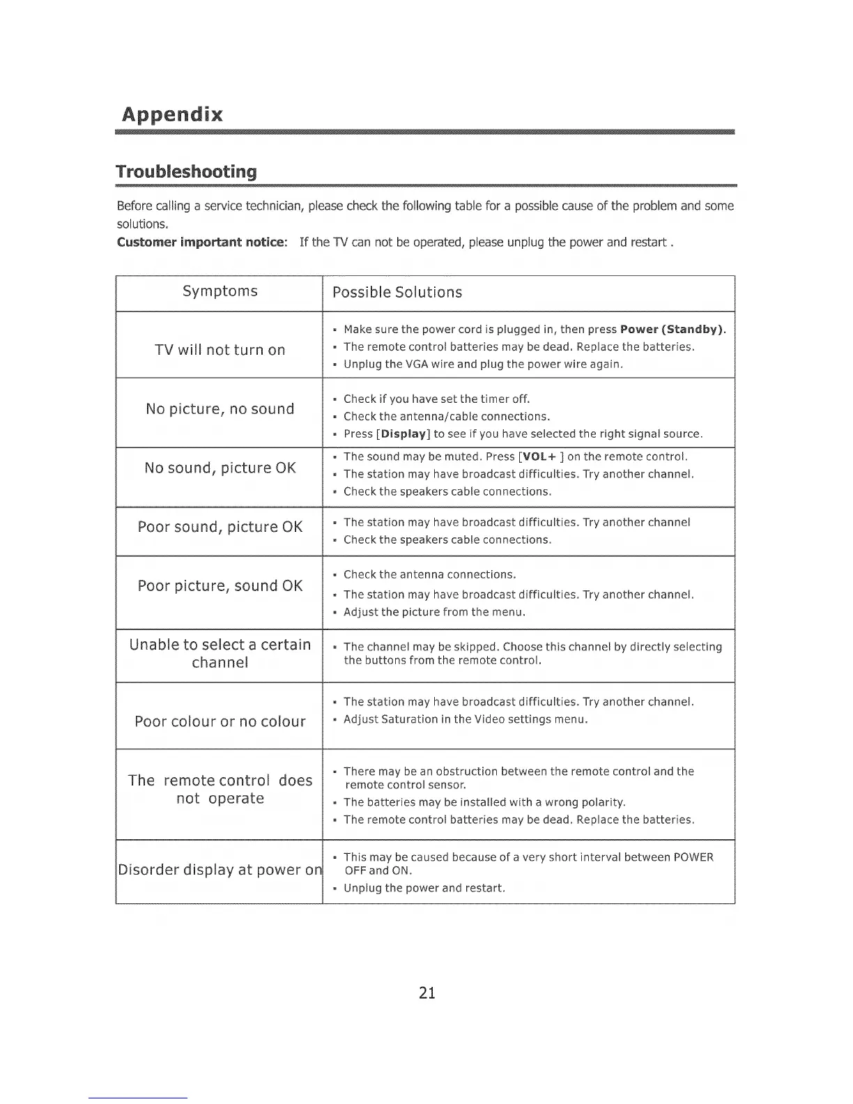 Before calling a service technician, please check the following table for a possible cause of the problem and some