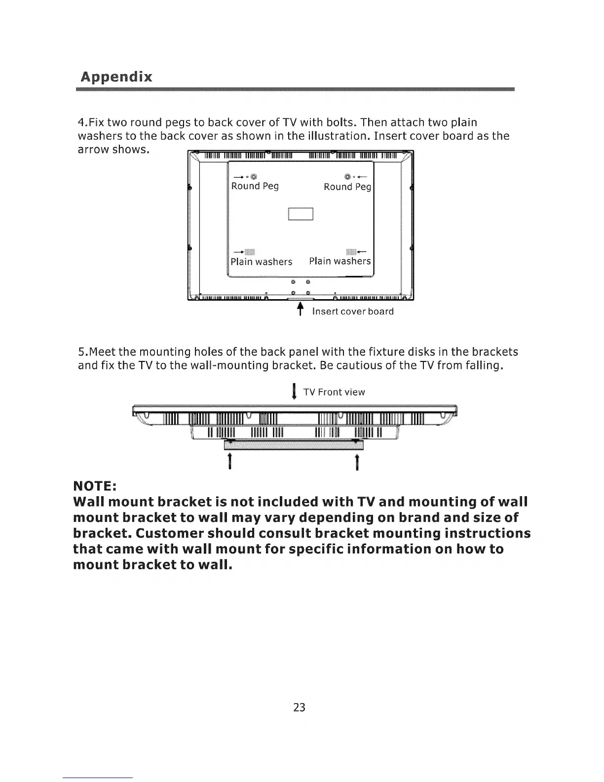 4.Fix two round pegs to back cover of TV with bolts. Then attach two plain