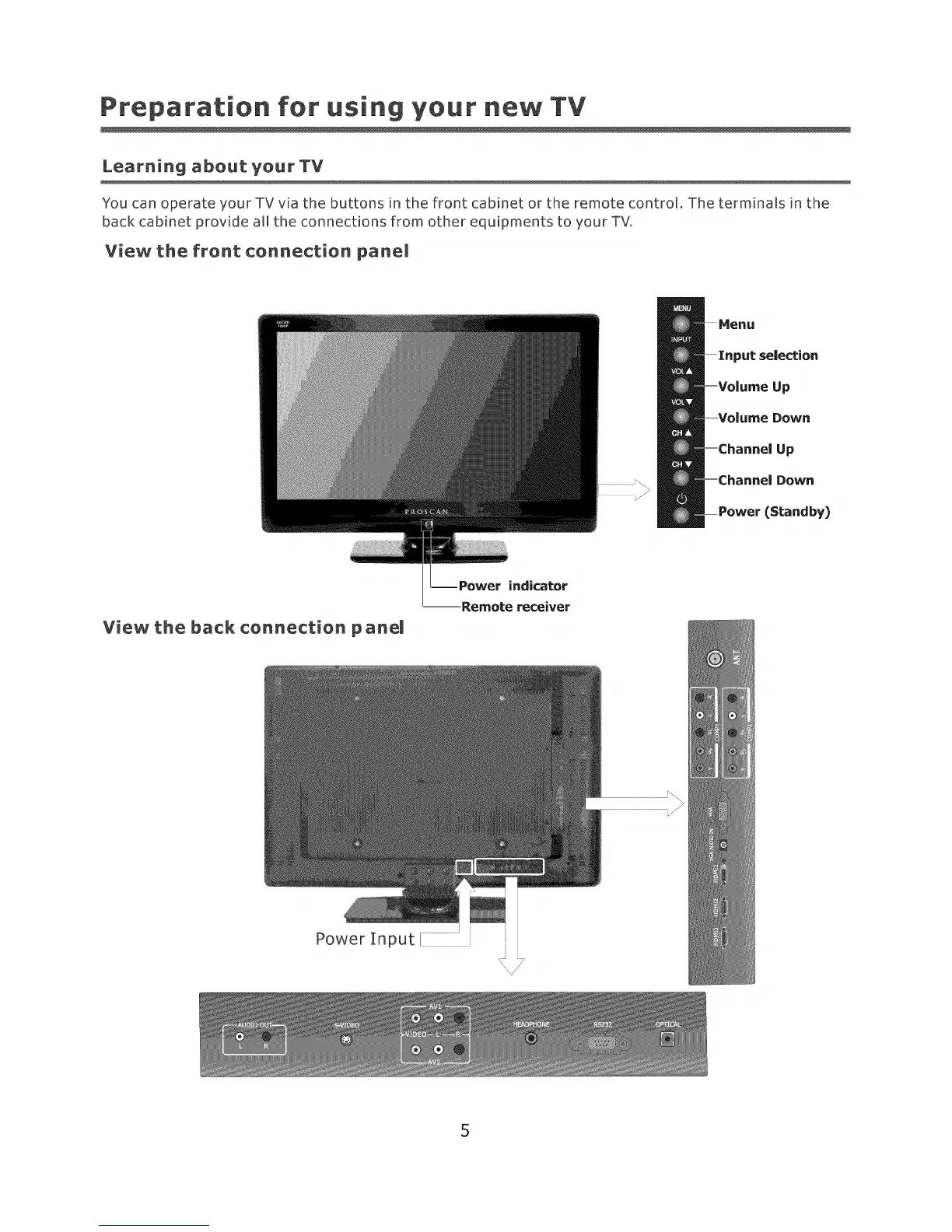 You can operate your TV via the buttons in the front cabinet or the remote control_ The terminals in the