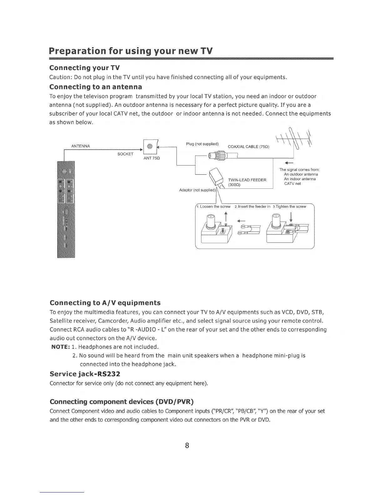 Caution: Do not plug in the TV until you have finished connecting all of your equipments.