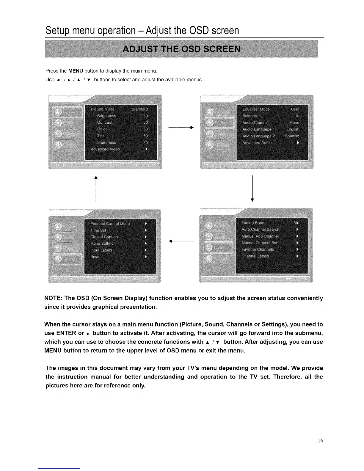 When the cursor stays on a main menu function (Picture, Sound, Channels or Settings), you need to