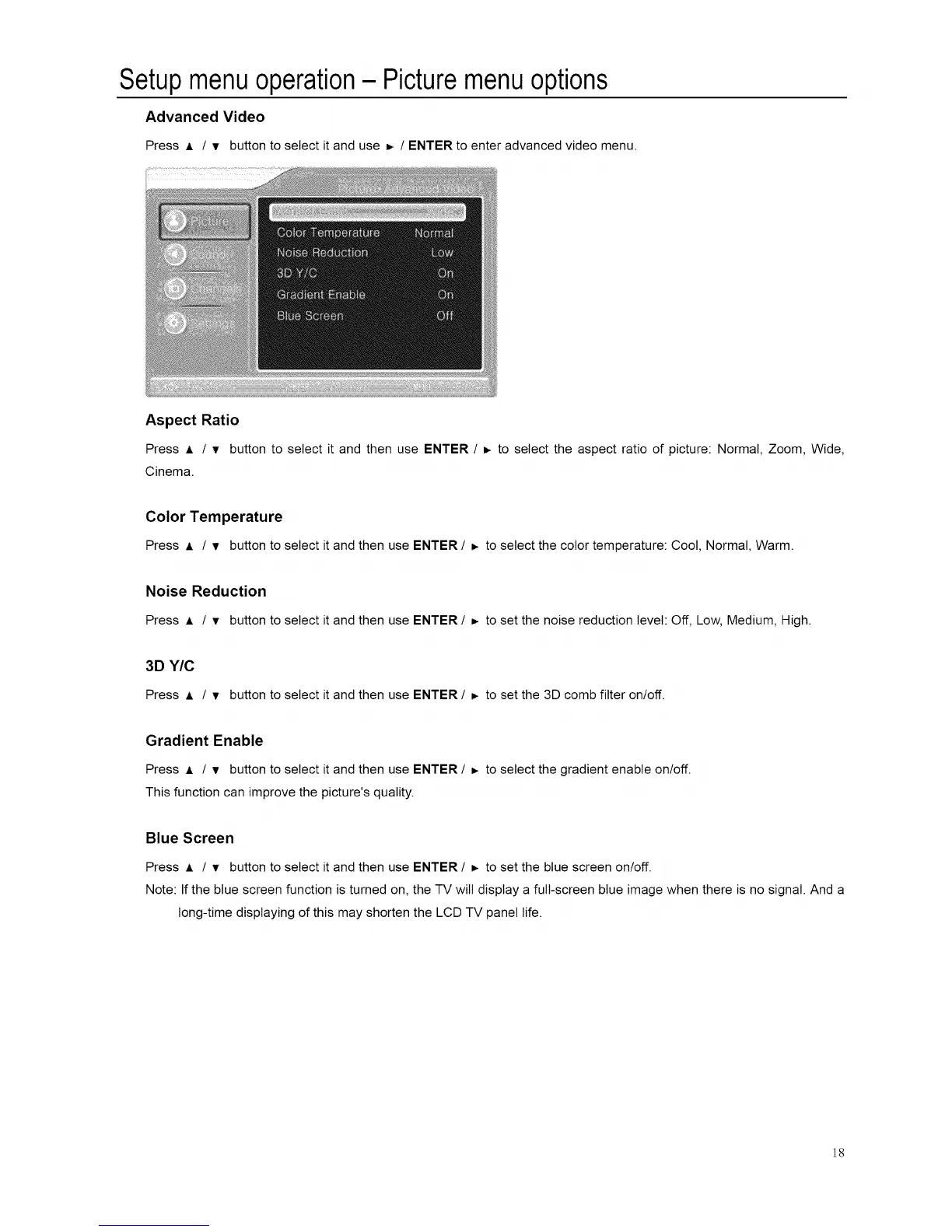 Press A / v button to select it and then use ENTER / _. to select the aspect ratio of picture: Normal, Zoom, Wide,