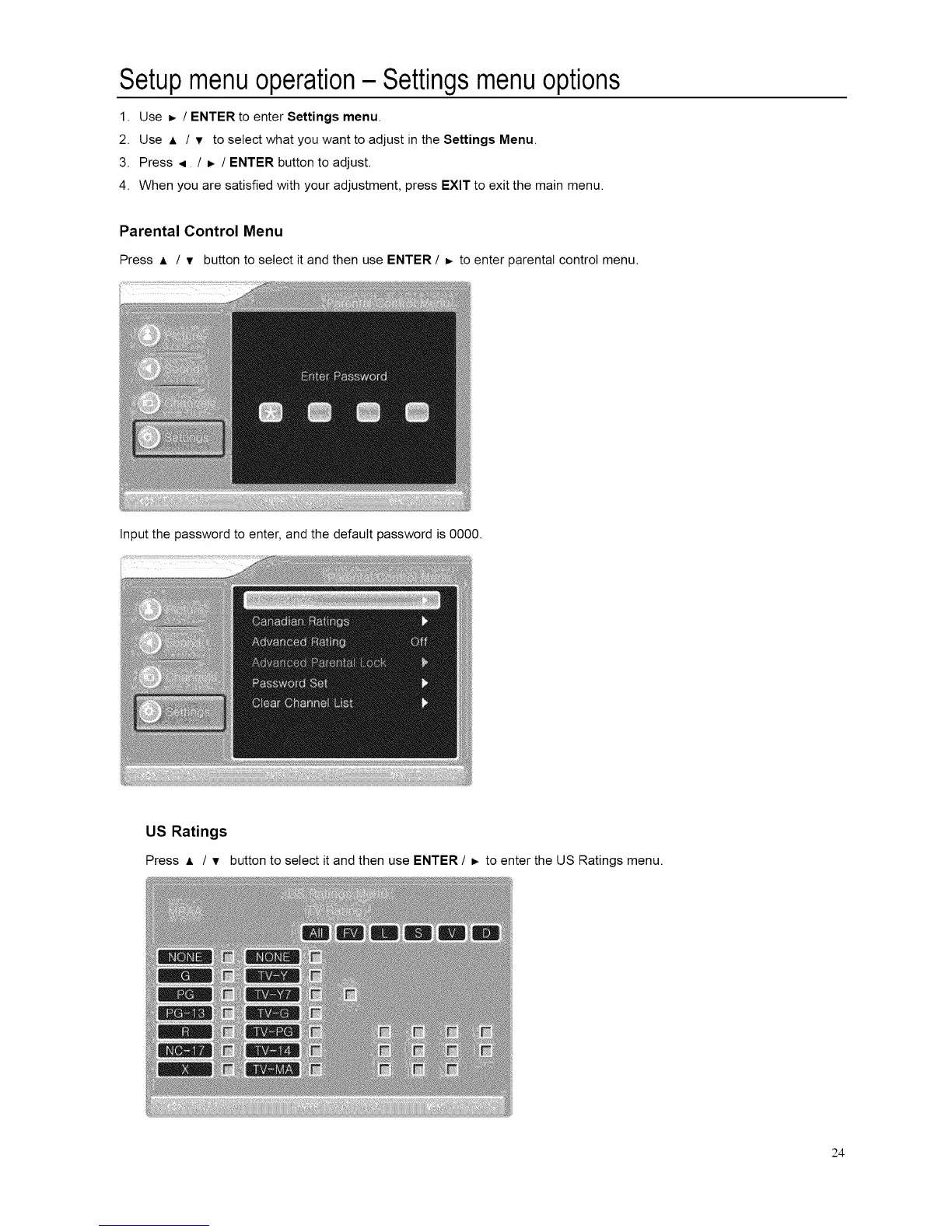 Press A / v buttonto select itandthen use ENTER / =, toenterthe US Ratings menu.