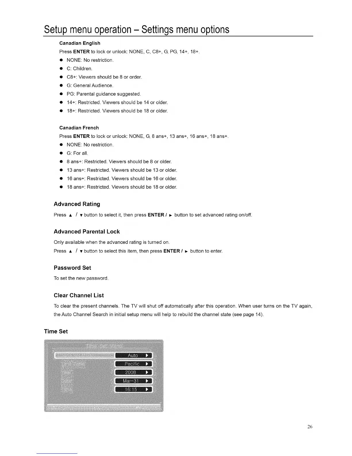 Press ENTER to lock or unlock: NONE, C, C8+, G, PG, 14+, 18+.