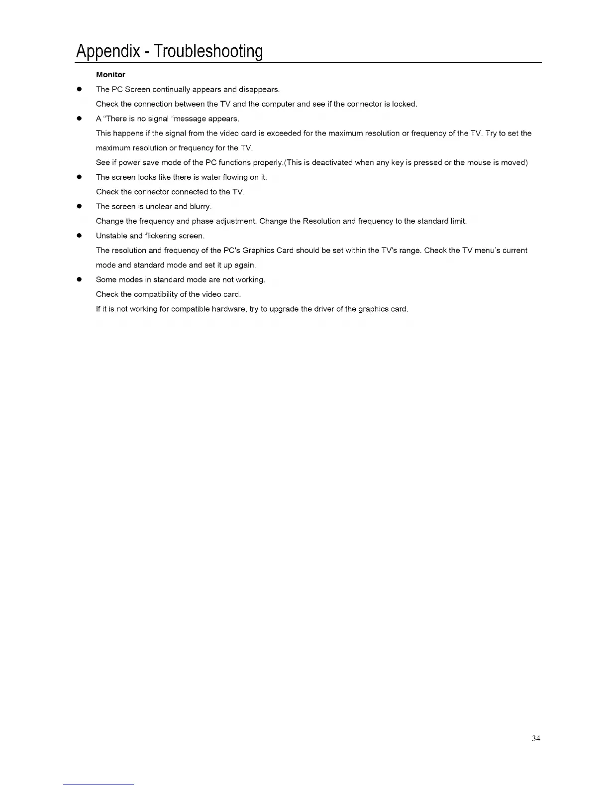The resolution and frequency of the PC's Graphics Card should be set within the TV's range. Check the TV menu's current