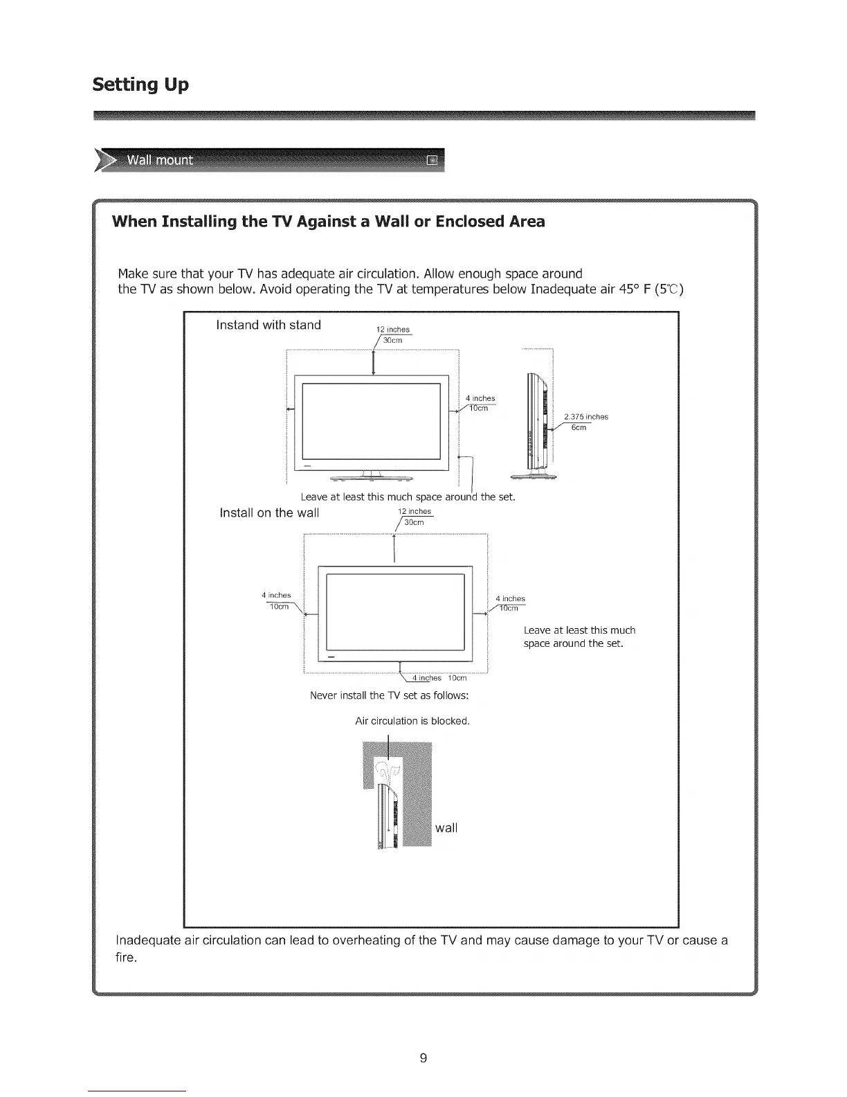 Inadequate air circulation can lead to overheating of the TV and may cause damage to your TV or cause a