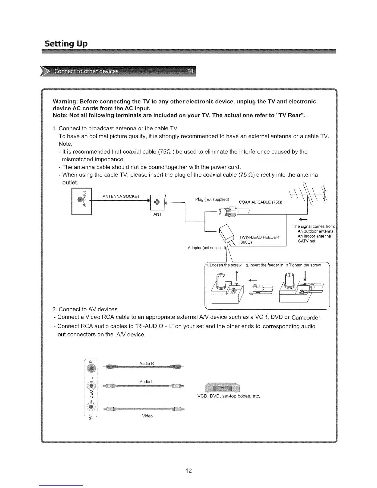 Warning: Before connecting the TV to any other electronic device, unplug the TV and electronic