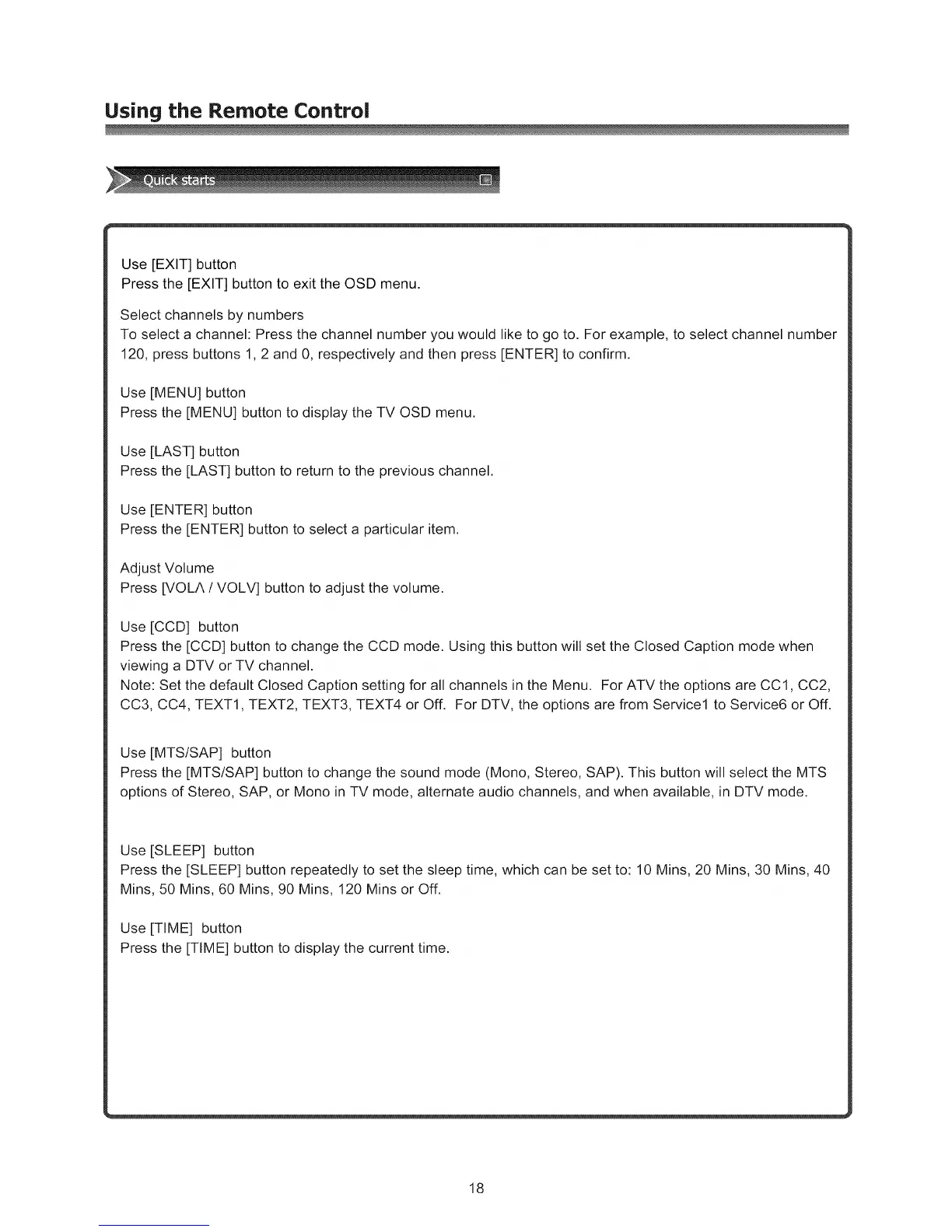 Press the [MTS/SAP] button to change the sound mode (Mono, Stereo, SAP). This button will select the MTS