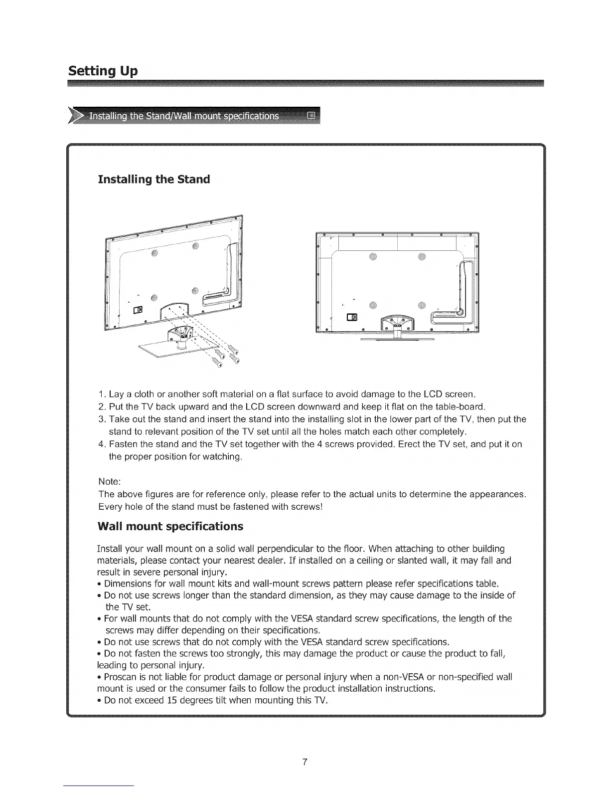 • Proscan is not liable for product damage or personal injury when a non-VESA or non-specified wall
