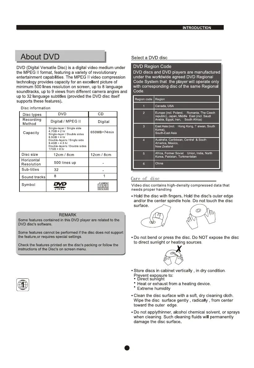 ProScan Elite PEDVD6657-EO - About DVD; DVD Disc Information; DVD Region Code; Care of Disc