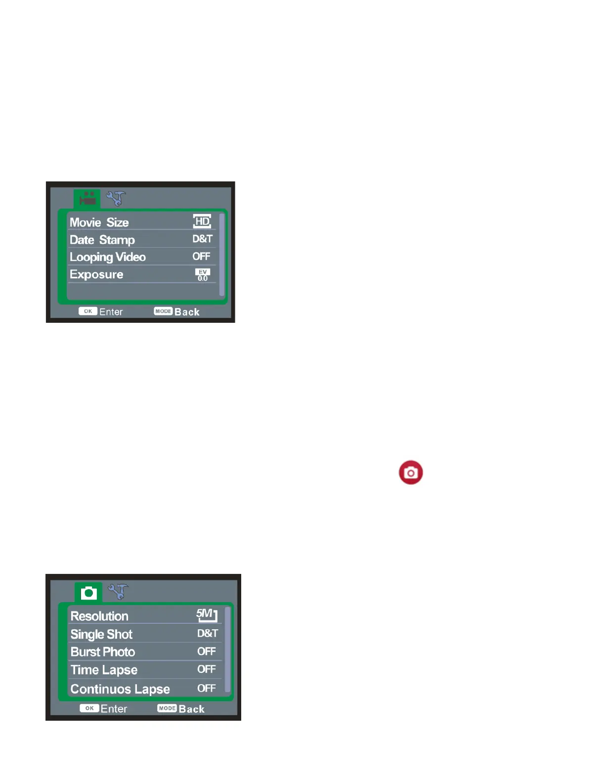 Exposure: choose up/down from +2 to -2 exposure, and press OK to confirm