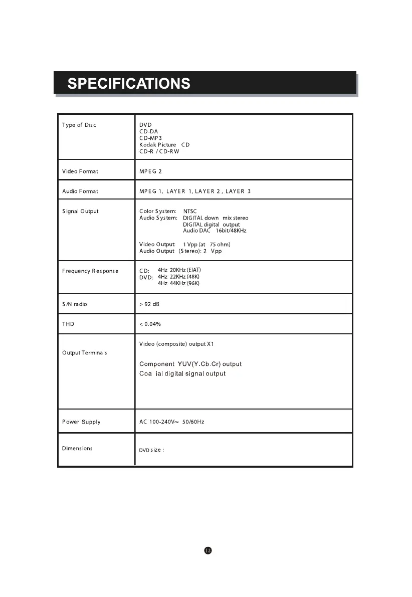 ProScan PDVD6655-B - SPECIFICATIONS; Disc and Format Compatibility; Signal Output and Frequency; Physical and Electrical Details