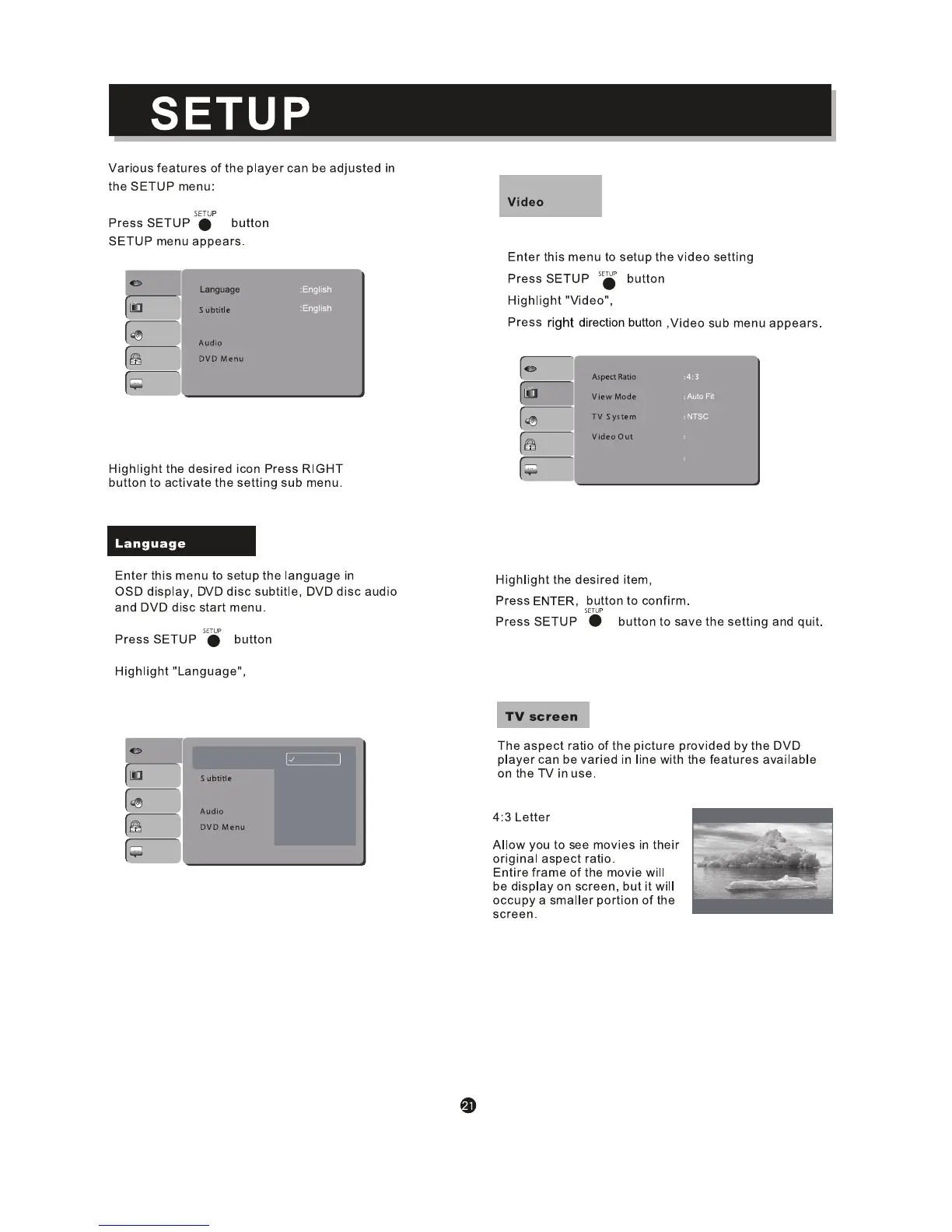 ProScan PDVD6655-PL - Setup Menu - Basic Settings; Video Settings Configuration; Language Settings Configuration