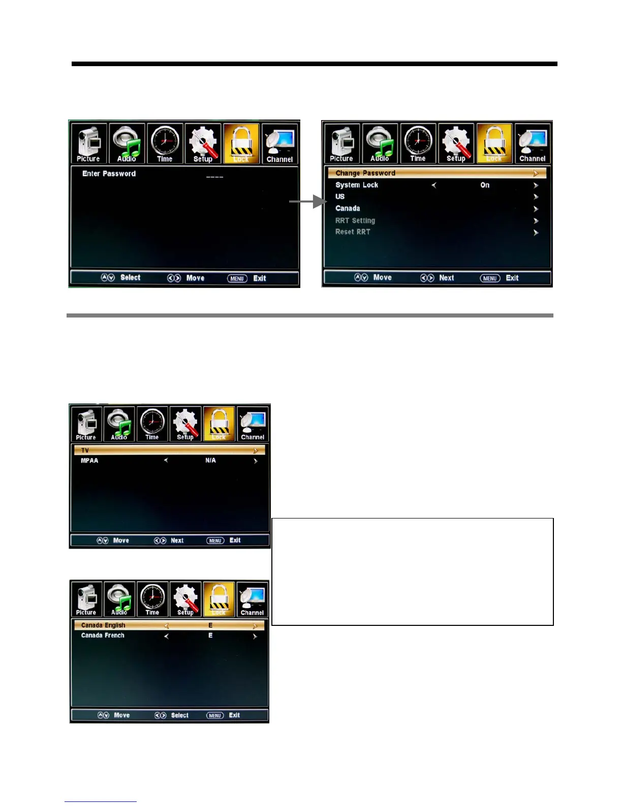 This option menu allows you to lock any TV channel or adjust the Movie rating filter.