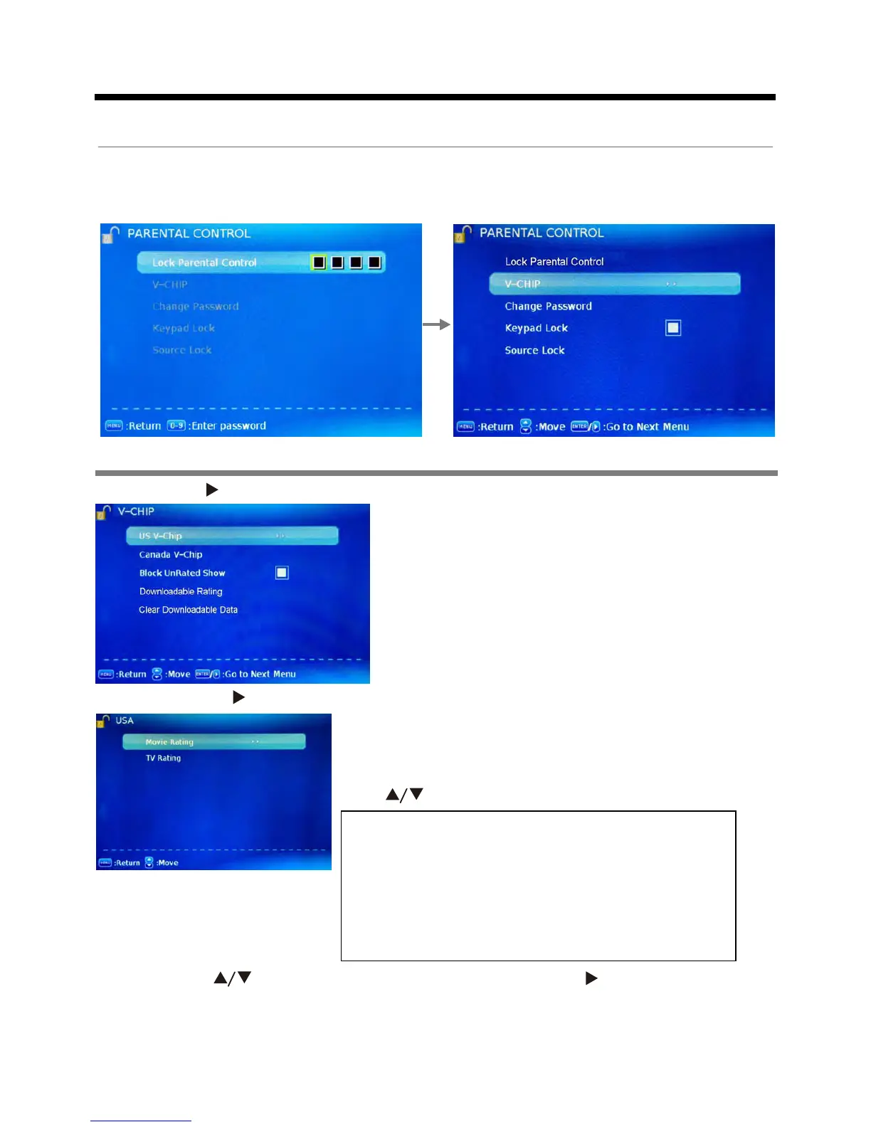 TV Rating: Use buttons to select the desired rating and press button to block or