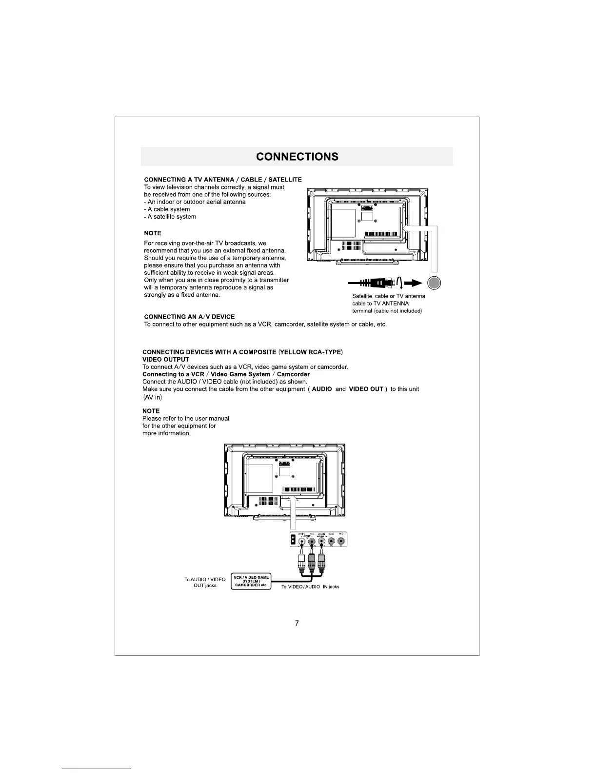 ProScan PLDED3273A-E - CONNECTIONS: BASIC INPUTS; ANTENNA, CABLE, AND SATELLITE CONNECTION; A;V AND COMPOSITE VIDEO CONNECTION