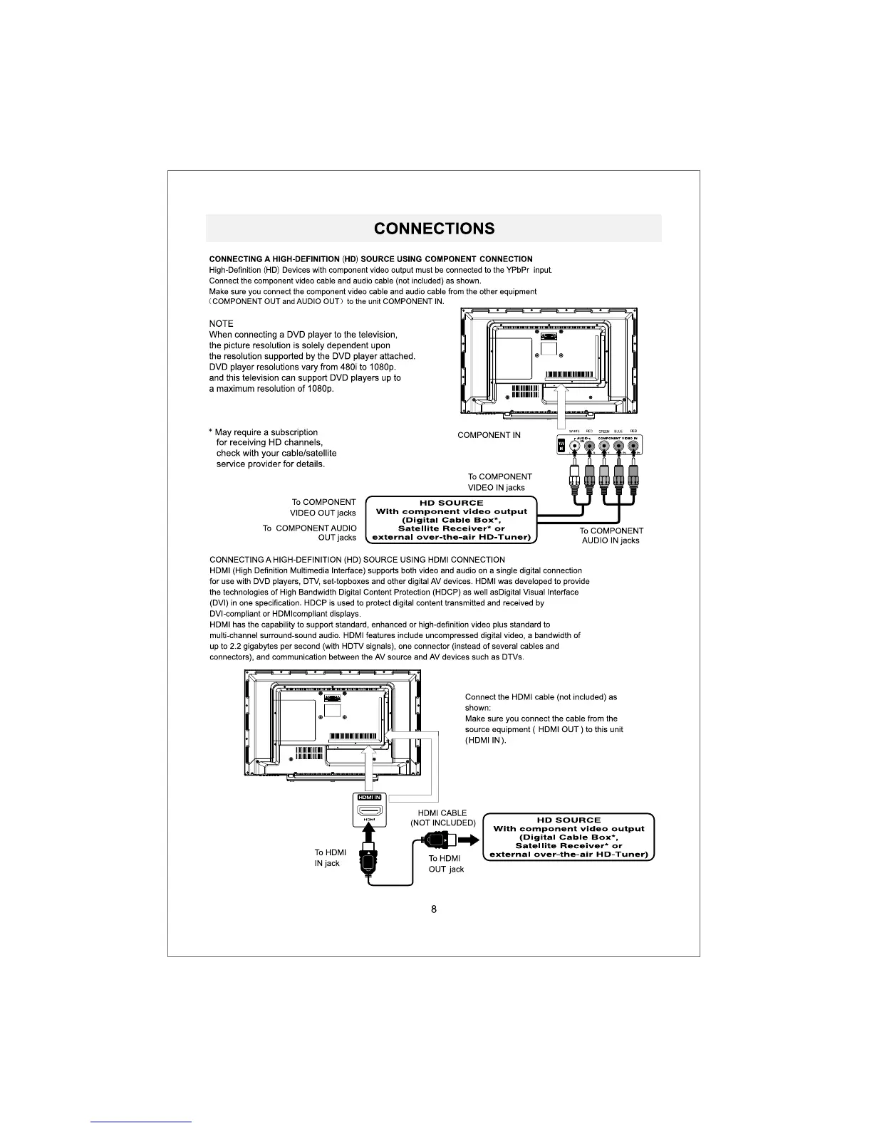 ProScan PLDED3273A-E - CONNECTIONS: HIGH-DEFINITION SOURCES; HD SOURCE VIA COMPONENT CONNECTION; HD SOURCE VIA HDMI CONNECTION