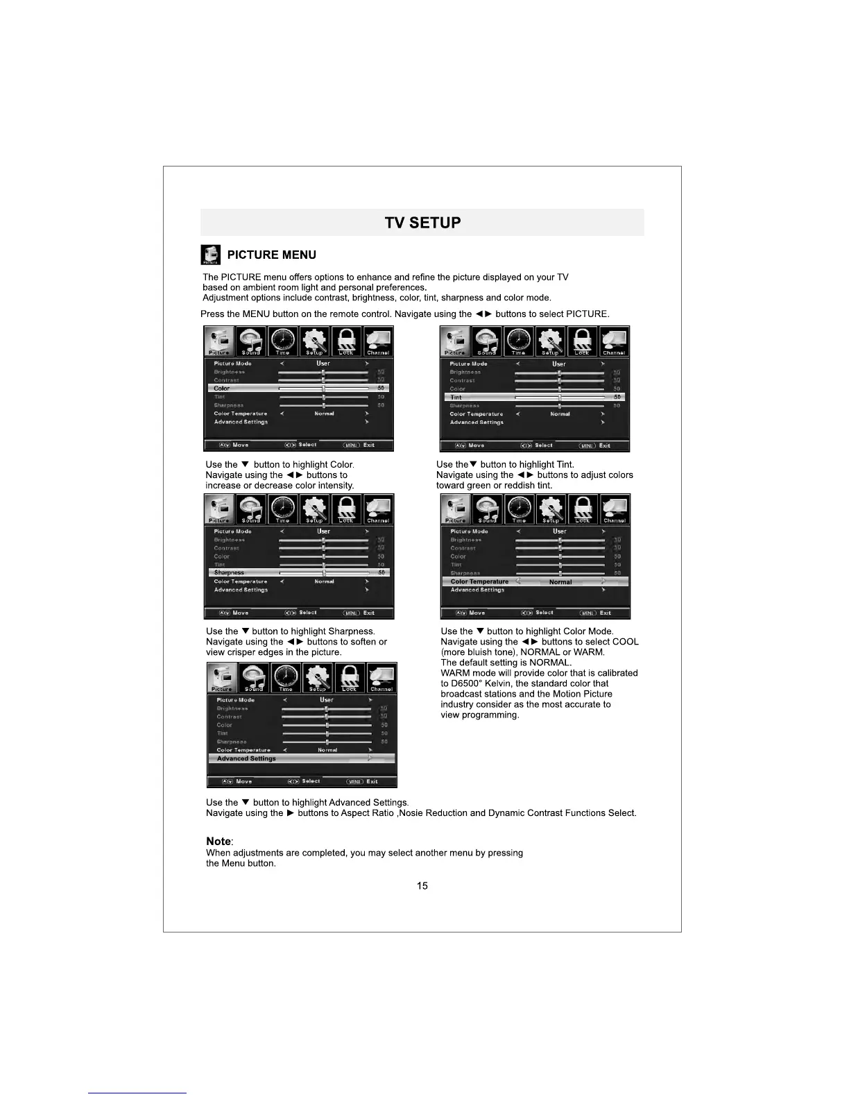 ProScan PLDED3273A-E - PICTURE MENU SETTINGS; ADJUSTING COLOR, TINT, SHARPNESS, AND MODE