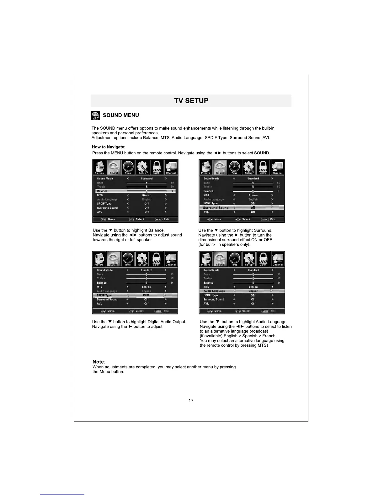 ProScan PLDED3273A-E - SOUND MENU SETTINGS; ADJUSTING BALANCE, SURROUND, AND AUDIO LANGUAGE