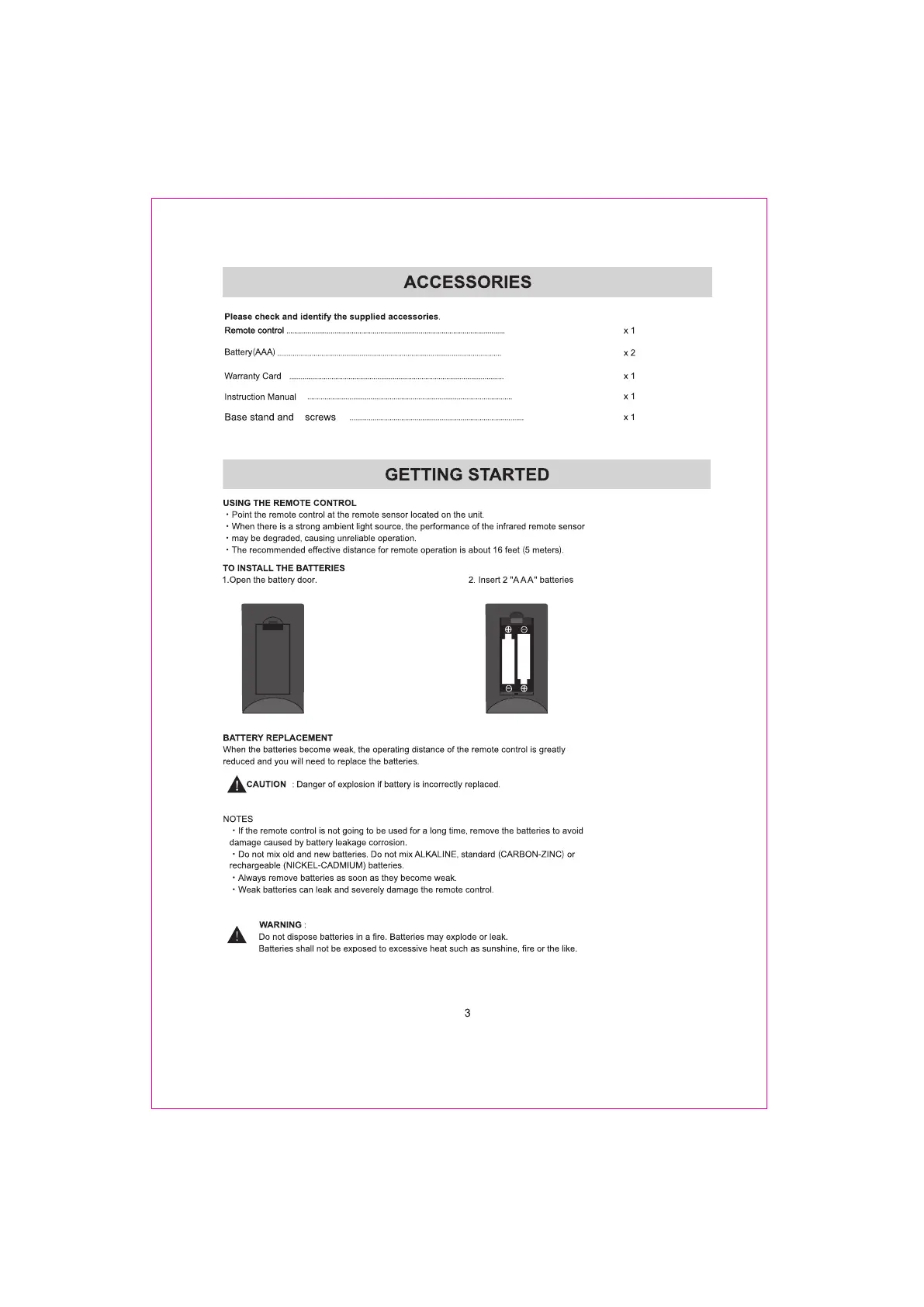 ProScan PLDED3281 - ACCESSORIES; GETTING STARTED; USING THE REMOTE CONTROL; TO INSTALL THE BATTERIES