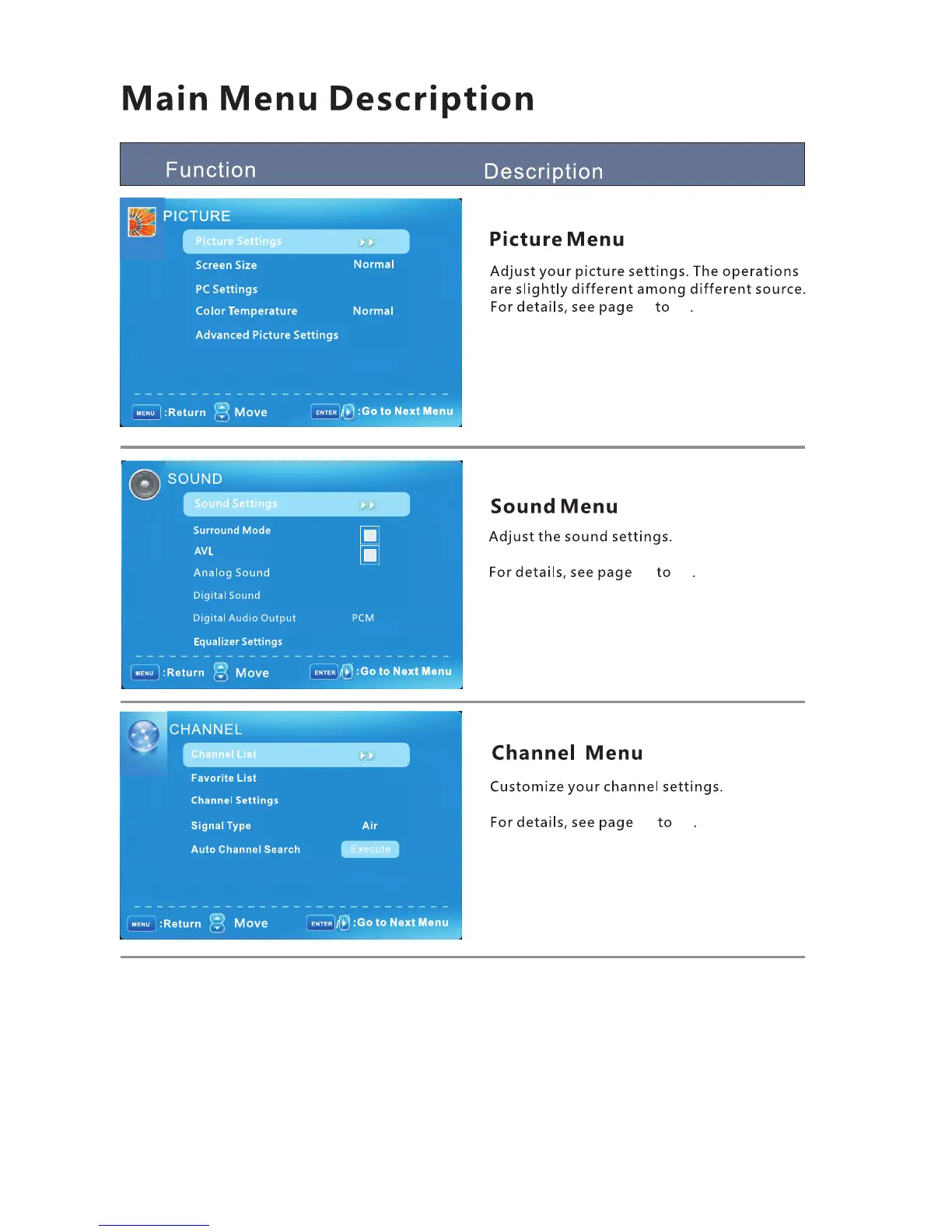 ProScan PLED1960A - Main Menu Structure; Picture Menu Overview; Sound Menu Overview; Channel Menu Overview