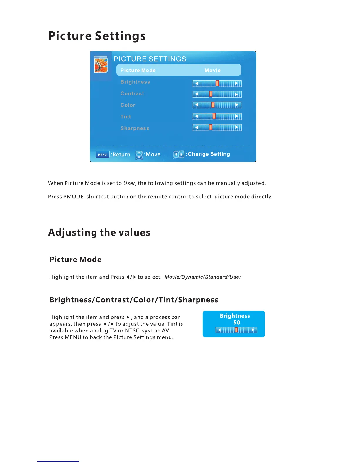 ProScan PLED1960A - Picture Settings Deep Dive; Picture Mode Selection; Adjusting Brightness, Contrast, Color, Tint, Sharpness