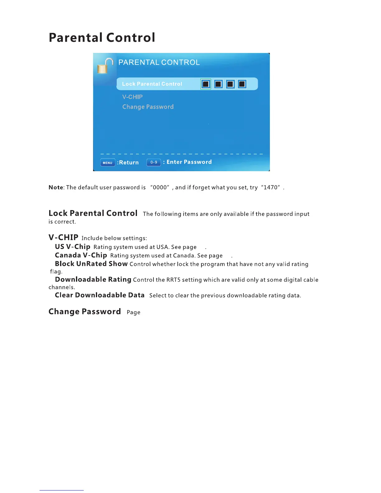 ProScan PLED1960A - Parental Control Features; Lock Parental Control Settings; V-Chip Rating Systems (US & Canada); Block Unrated Shows and Downloadable Ratings