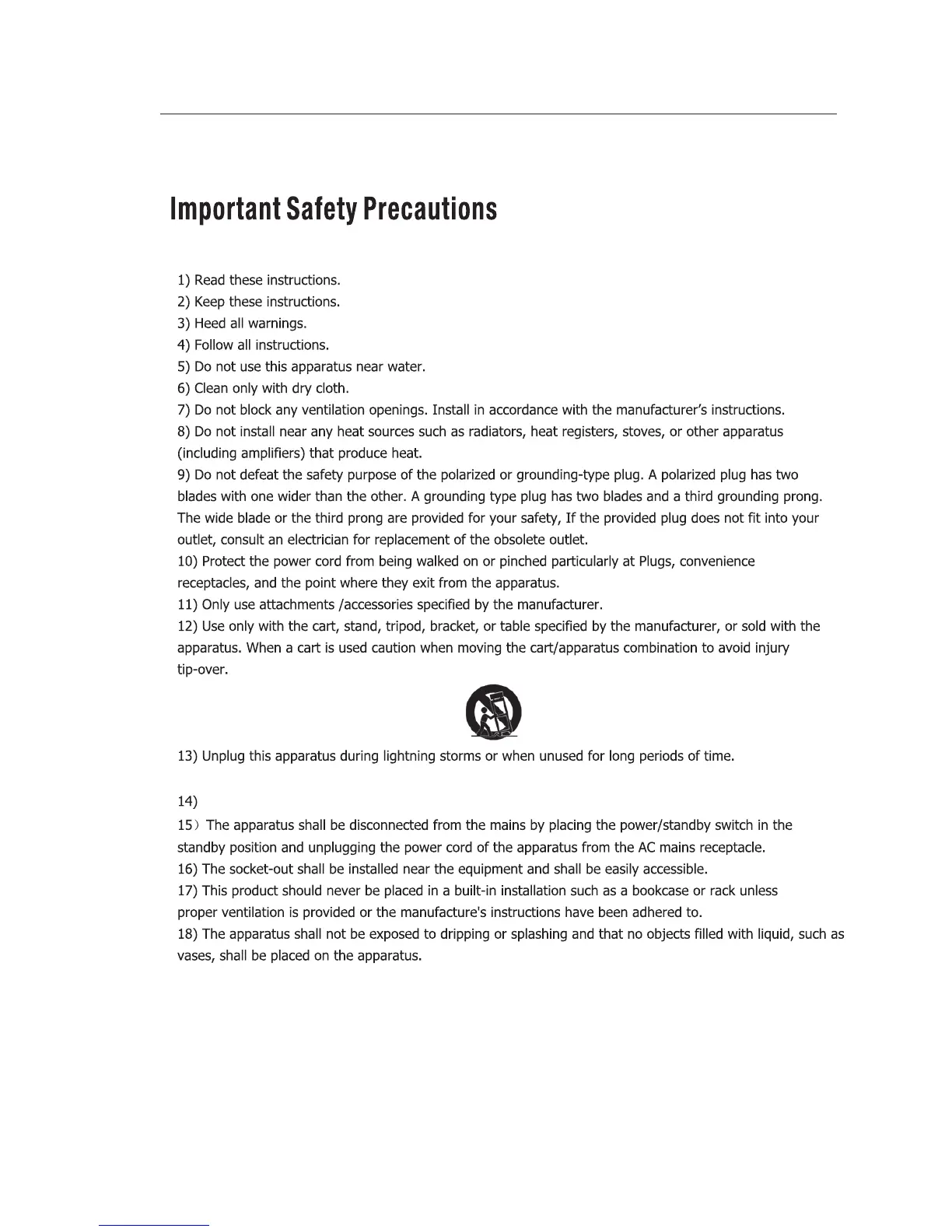 19) Do not place any sources of danger on the apparatus (e.g. liquid filled objects, lighted candles).