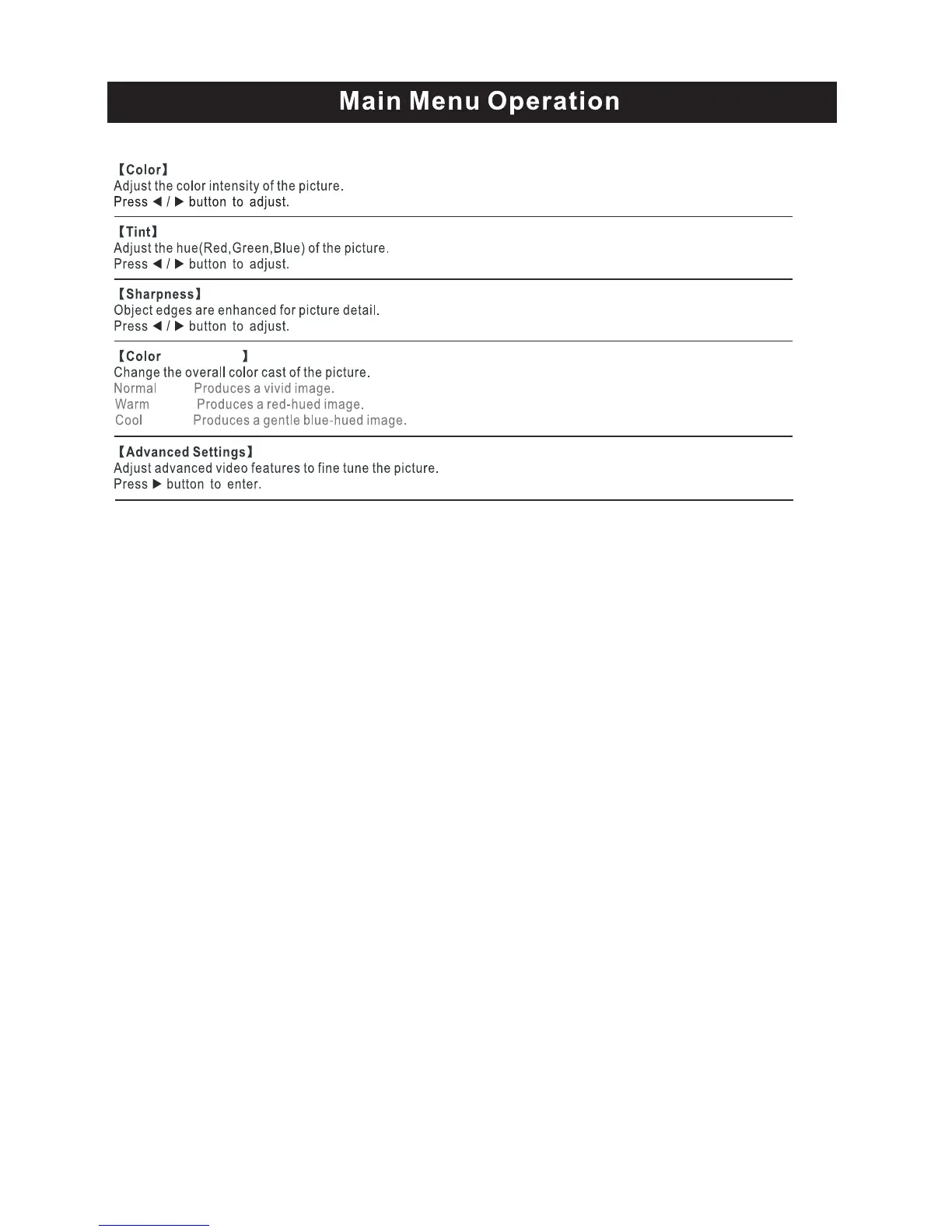 ProScan PLED2243A-C - Picture Menu Adjustments; Color and Tint Settings; Sharpness and Color Temperature; Advanced Settings